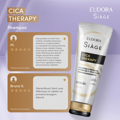 O Shampoo Siàge Cica-Therapy faz uma limpeza gentil que limpa as madeixas suavemente sem ressecar. A tecnologia de Siàge Cica-Therapy traz uma terapia capilar duradoura para cicatrização das áreas danificadas do cabelo. A cicatrização é o tratamento que recupera a saúde dos fios, devolve nutrientes essenciais e protege contra agressões diárias com os poderosos ativos Esqualano e Ômegas 3 e 6.